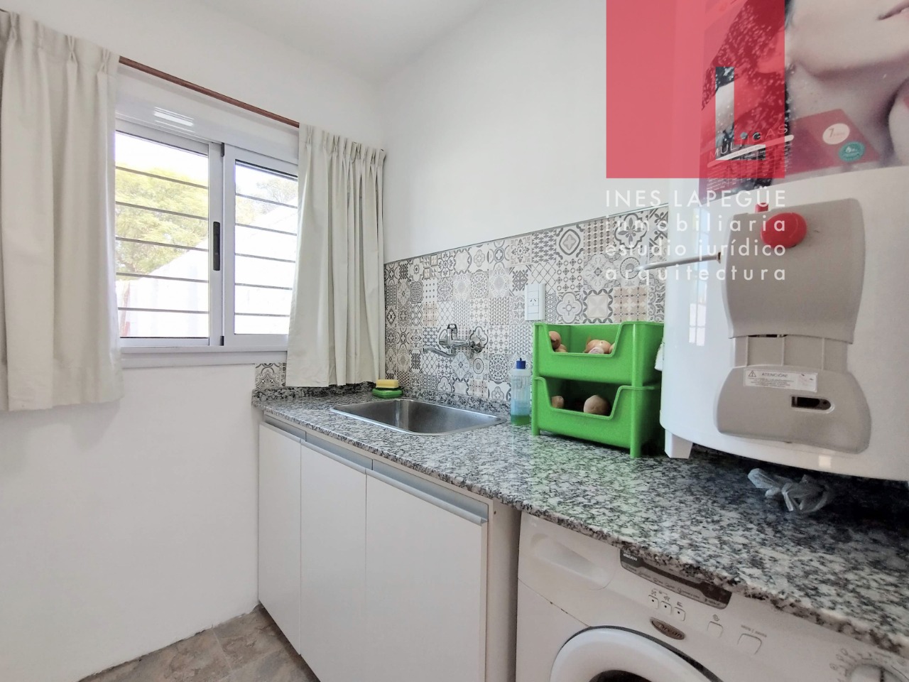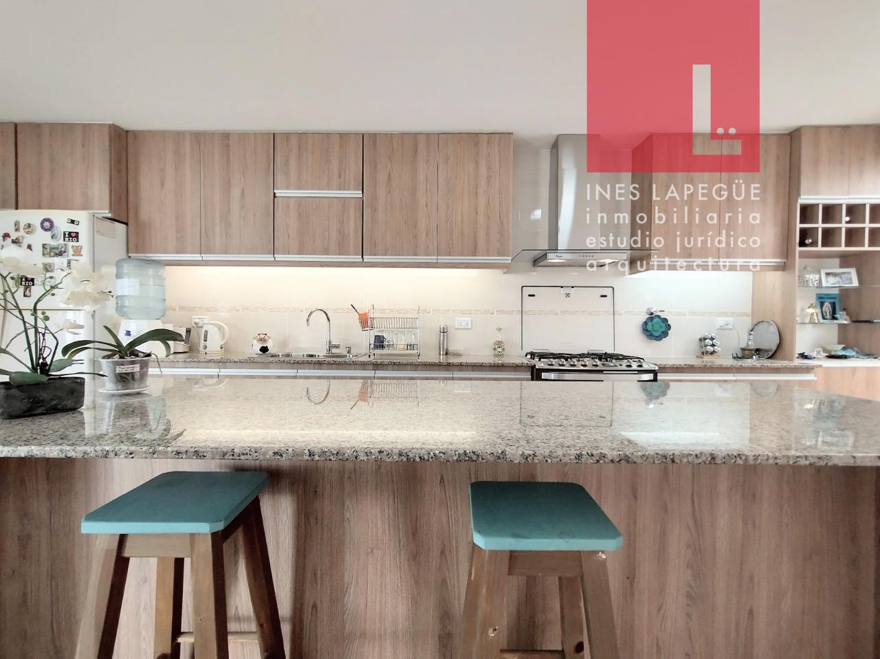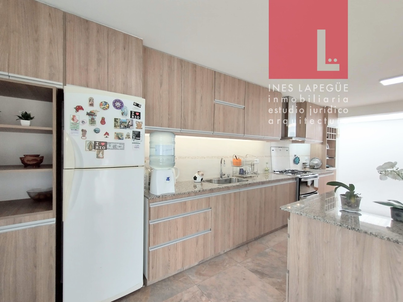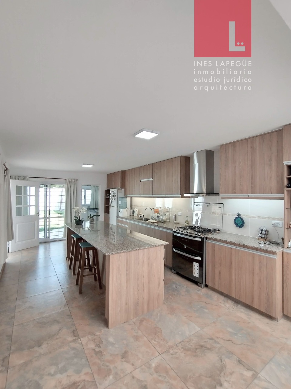 Gran cocina con isla central, con espacios de almacenamiento y barra. Vinculada a un amplio espacio exterior semi cubierto con asador y al lavadero.