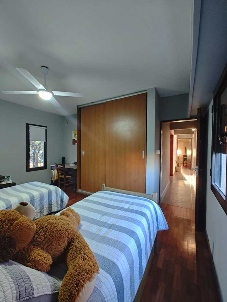 El exterior de la casa es un verdadero oasis con un gran patio forestado y una refrescante pileta, ideal para disfrutar del aire libre. El barrio Los Arándanos ofrece seguridad las 24 horas, un pintoresco lago propio y cancha de tenis, asegurando un estilo de vida tranquilo y activo.