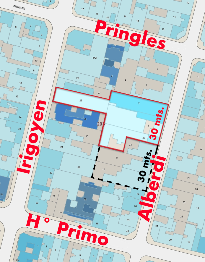 - Frente: 30 mts. lineales sobre calle Alberdi: Posibilidad de encuadre en tipología TORRE.