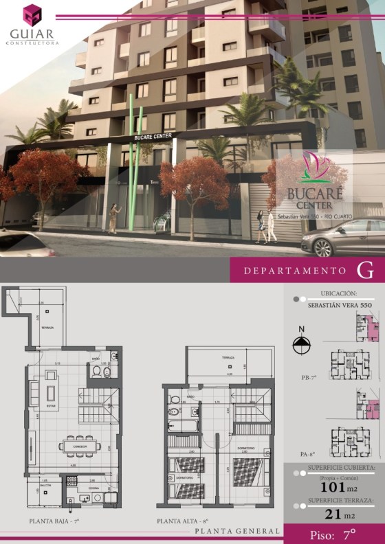 101 m2 totales (propios + comunes). Balcón 21 m2. Departamento dúplex de 2 dormitorios, baño con bañera, toilette, cocina separada, … Más