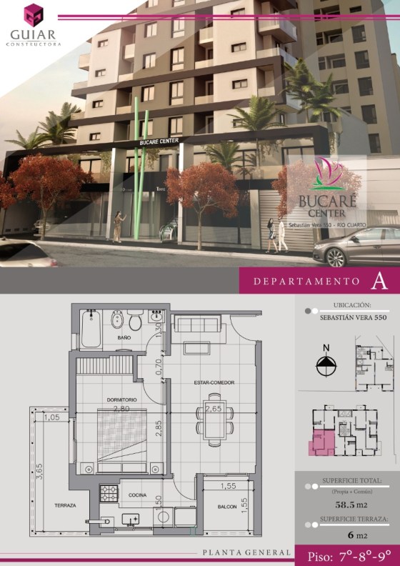 58 m2 totales (propios + comunes). Terraza 6 m2. Balcón 2,4 m2. Departamento de 1 dormitorio, baño con bañera, cocina … Más